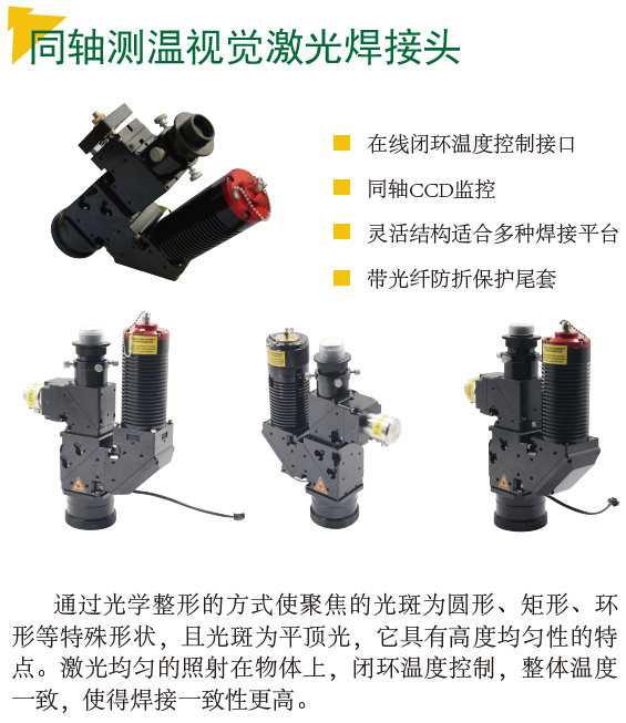针对未来制造对高精度和低热损的苛刻要求,松盛光电推出了极具行业颠覆性的解决方案。其核心产品——同轴测温视觉方形光斑激光焊接头,创新性地将圆形光斑整形为方形平顶光斑,实现了光束能量的均匀分布,完美解决了条状焊盘和大面积焊接中温度分布不均的痛点。