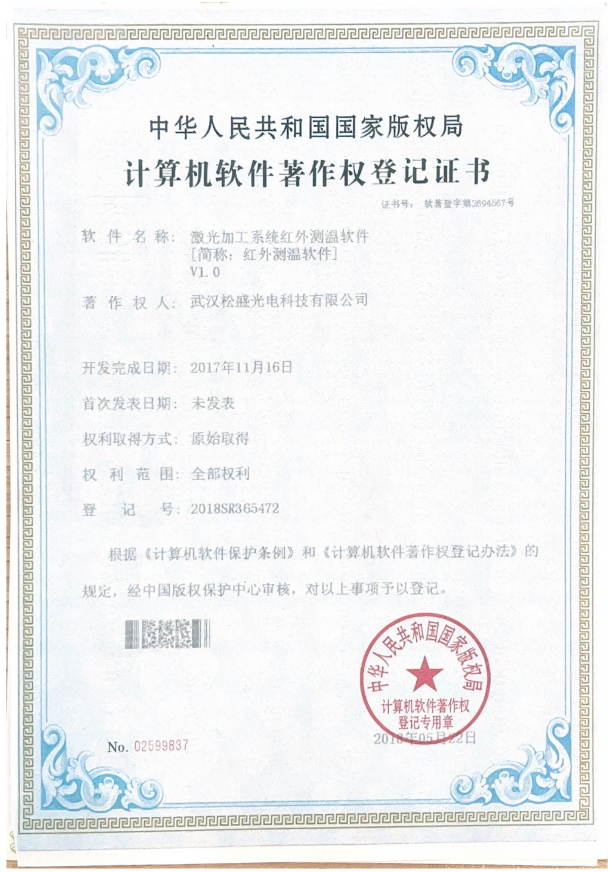 激光加工系统红外测温软件V1.0证书